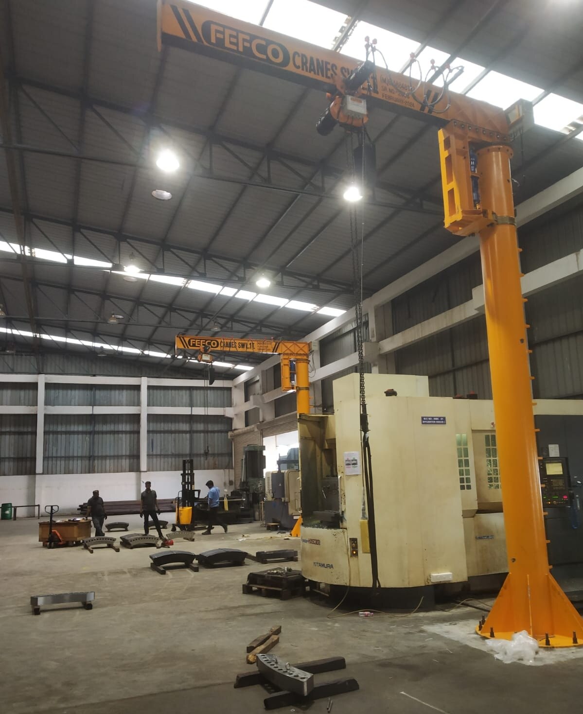 Fefco offer base mounted, free standing jib cranes. This units are engineered and designed for floor mounting. Units rotate 360 degrees and 180 degree and are available in a variety of capacity, height and span. The booms conform to ISO standards and have removable end stops for rapid trolley installation. Product Features 1) Heavy-duty assembly with reinforcing side plates 2) Full plate style gussets for maximum load distribution. 3) Heavy-duty top thrust bearing with pressure fitted housing for ease of rotation. 4) Heavy-duty roller cage that is built to last with steel rollers with low friction bearings, adjustable tension bolts, keeper bar and zerk fittings. 5) Anti-tip angles to prevent head removal from accidental impact. 6) Spacer rods to prevent head assembly plate flexing.